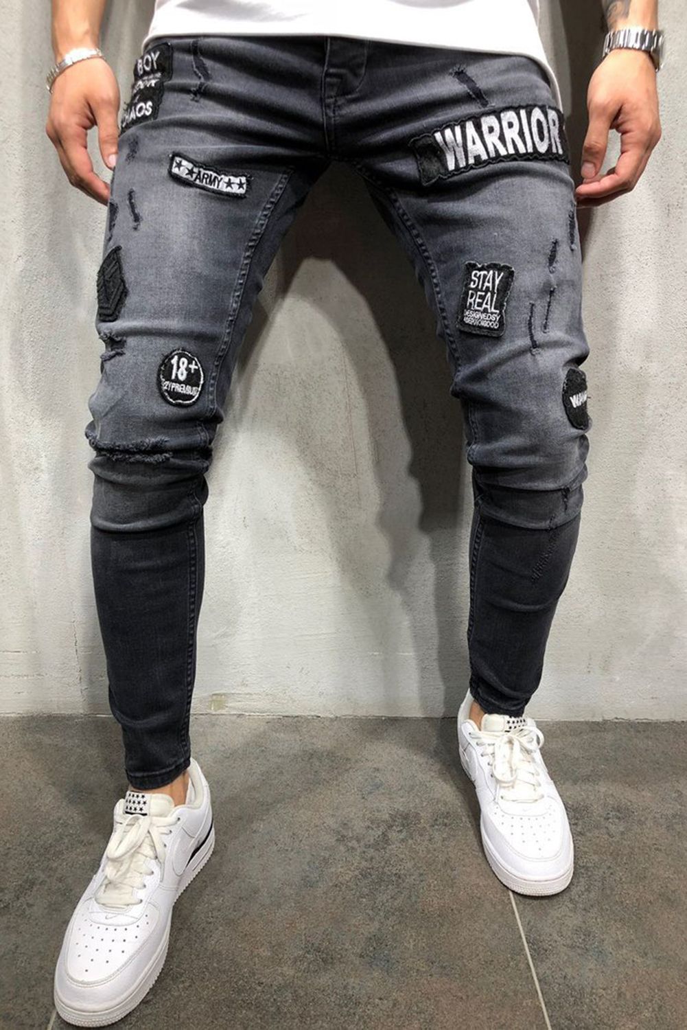 Men's Black Ripped Badge Applique Stiletto Jeans