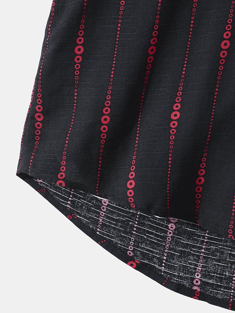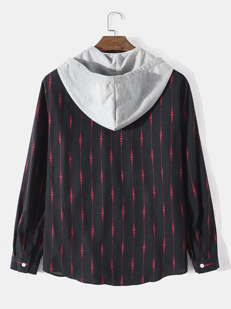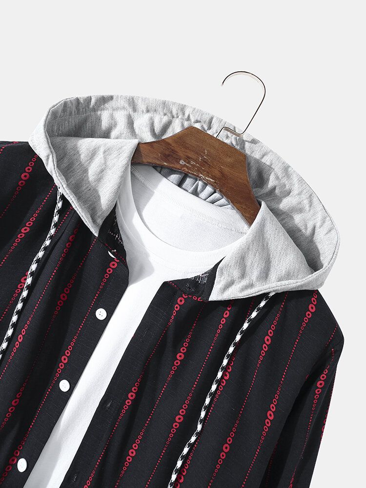 Mens Striped Geometric Print Button Up Cotton Drawstring Hooded Shirts