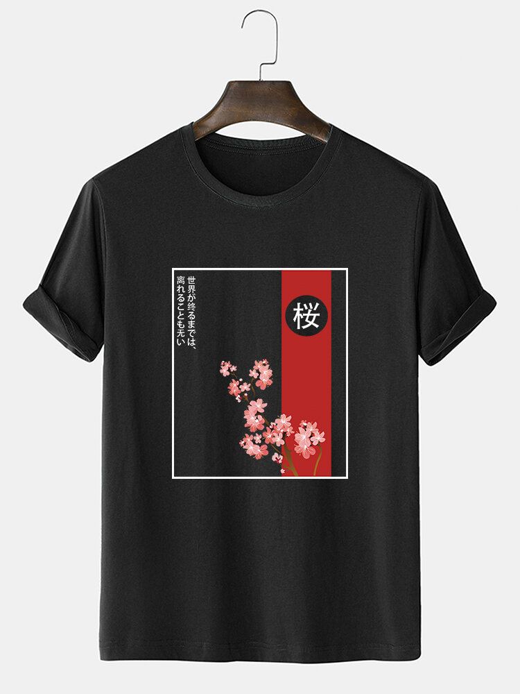 Mens Floral Japanese Graphic Crew Neck Short Sleeve Cotton T-Shirts
