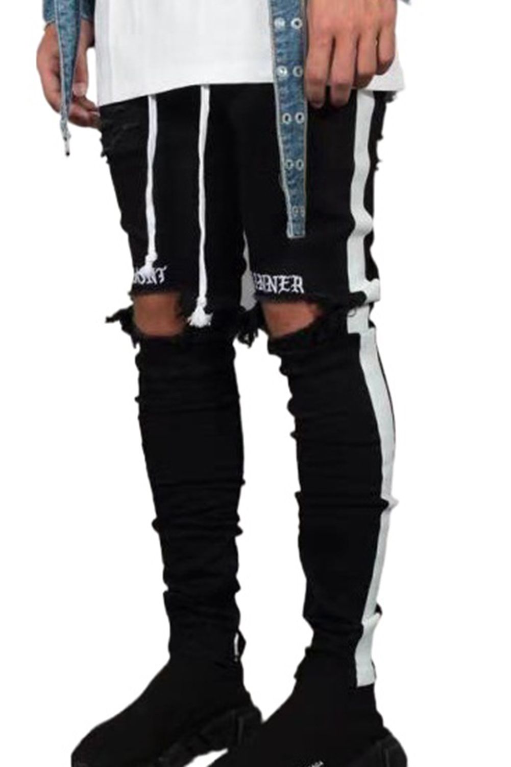 Black Letter Striped Print Ripped Slim-fit Men's Jeans