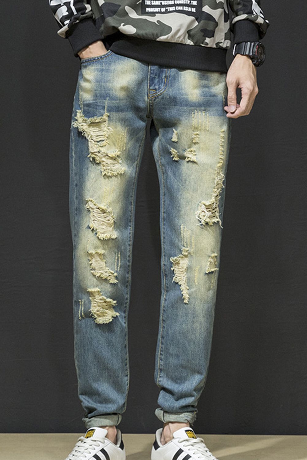 Distressed Wash Buttoned Straight Leg Men's Jeans