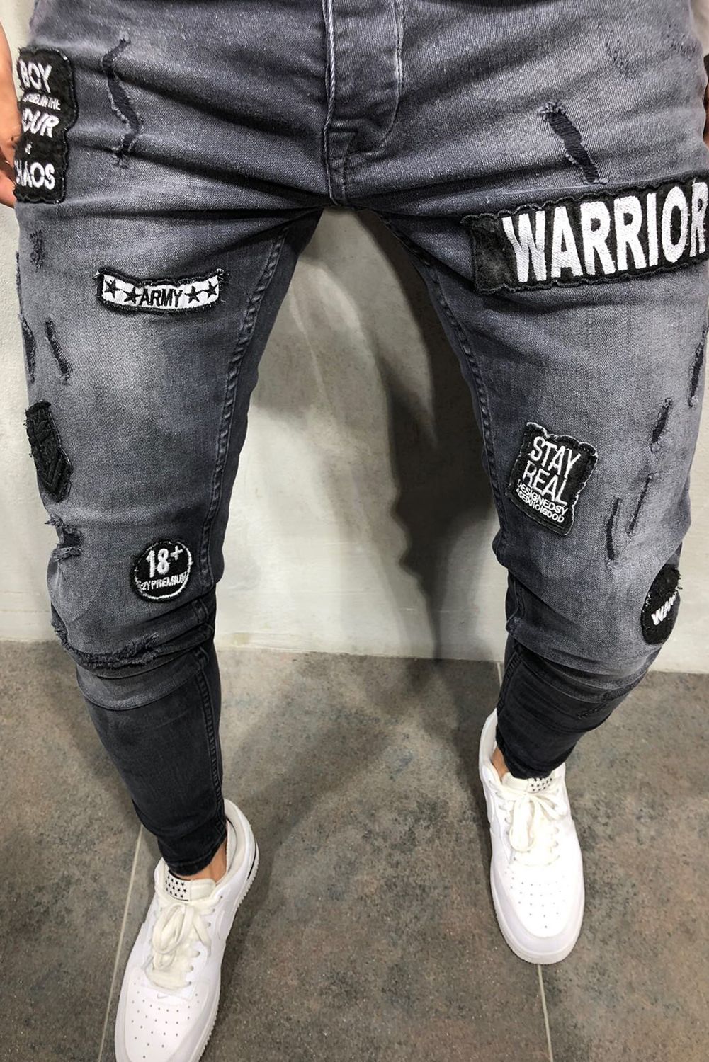 Men's Black Ripped Badge Applique Stiletto Jeans