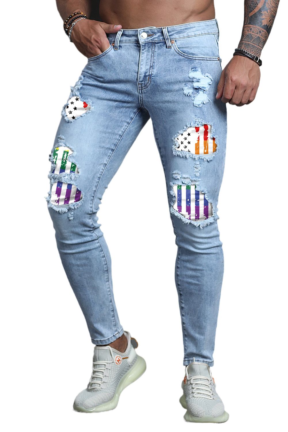 Sky Blue Men Stripes and Stars Print Ripped Skinny Jeans