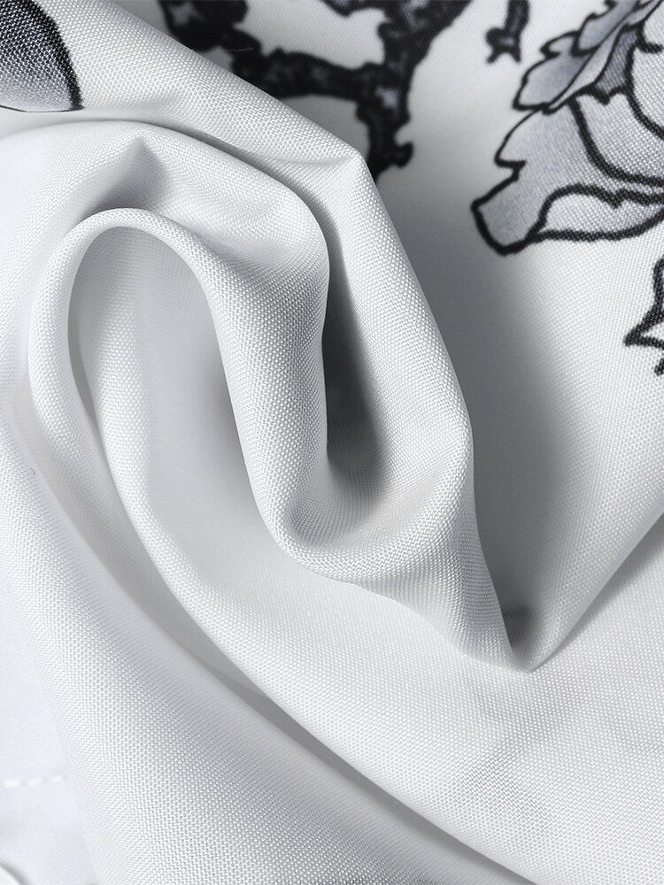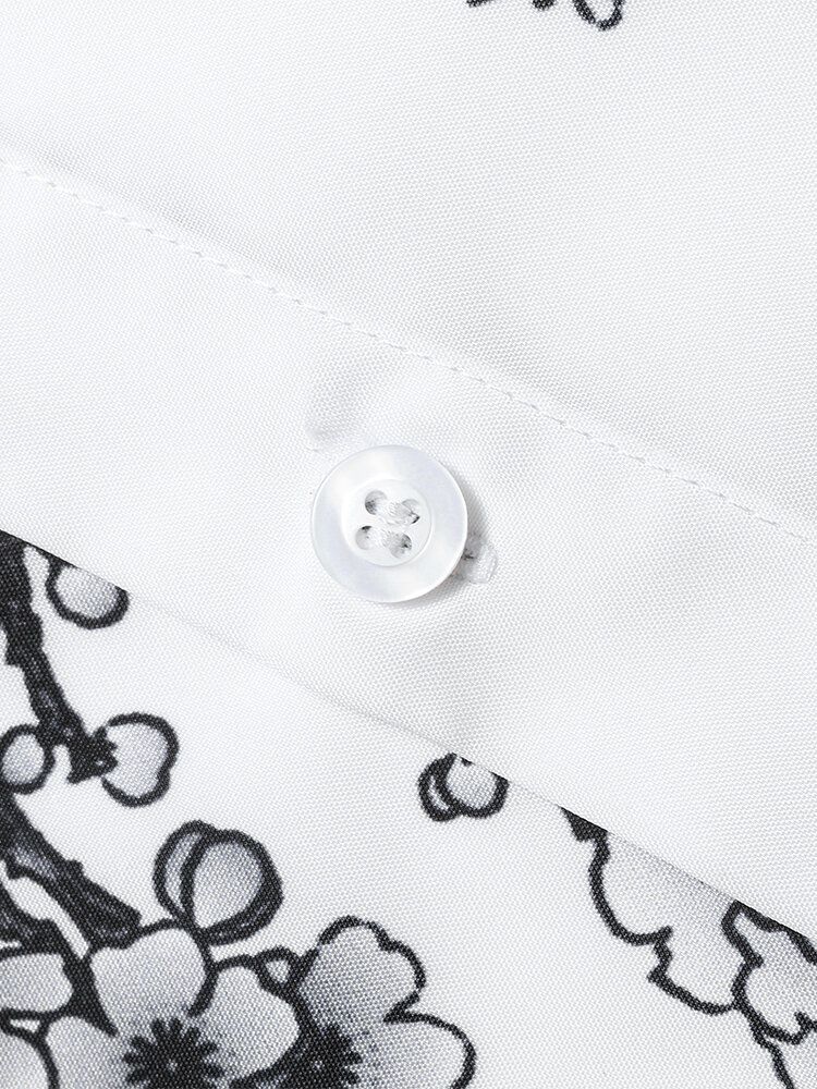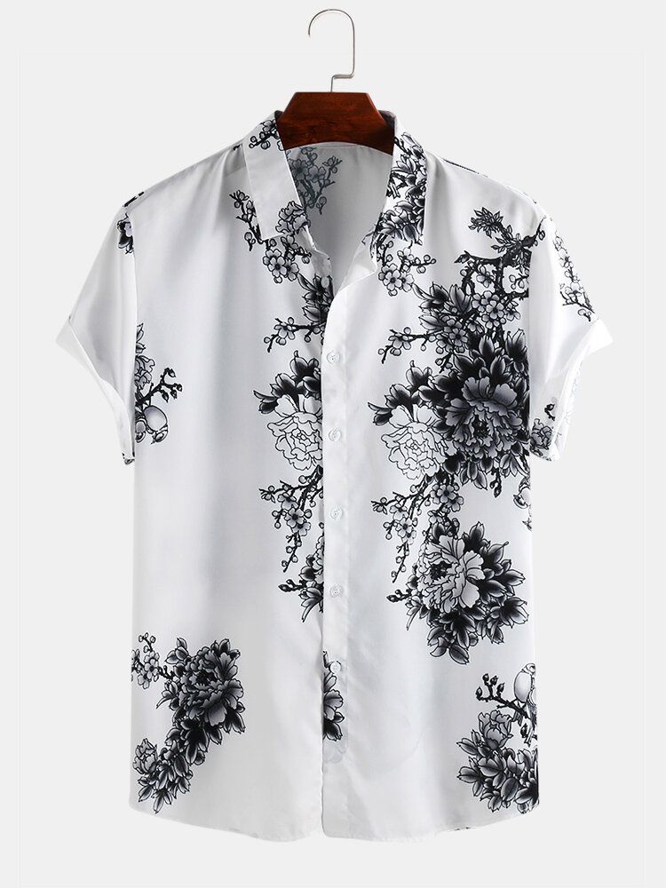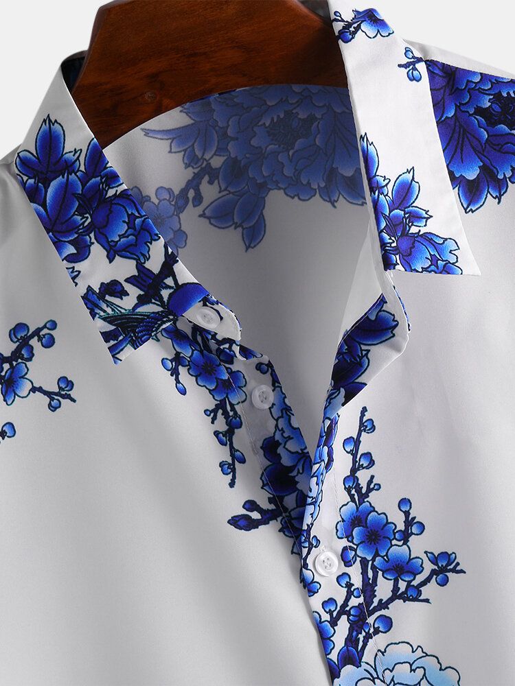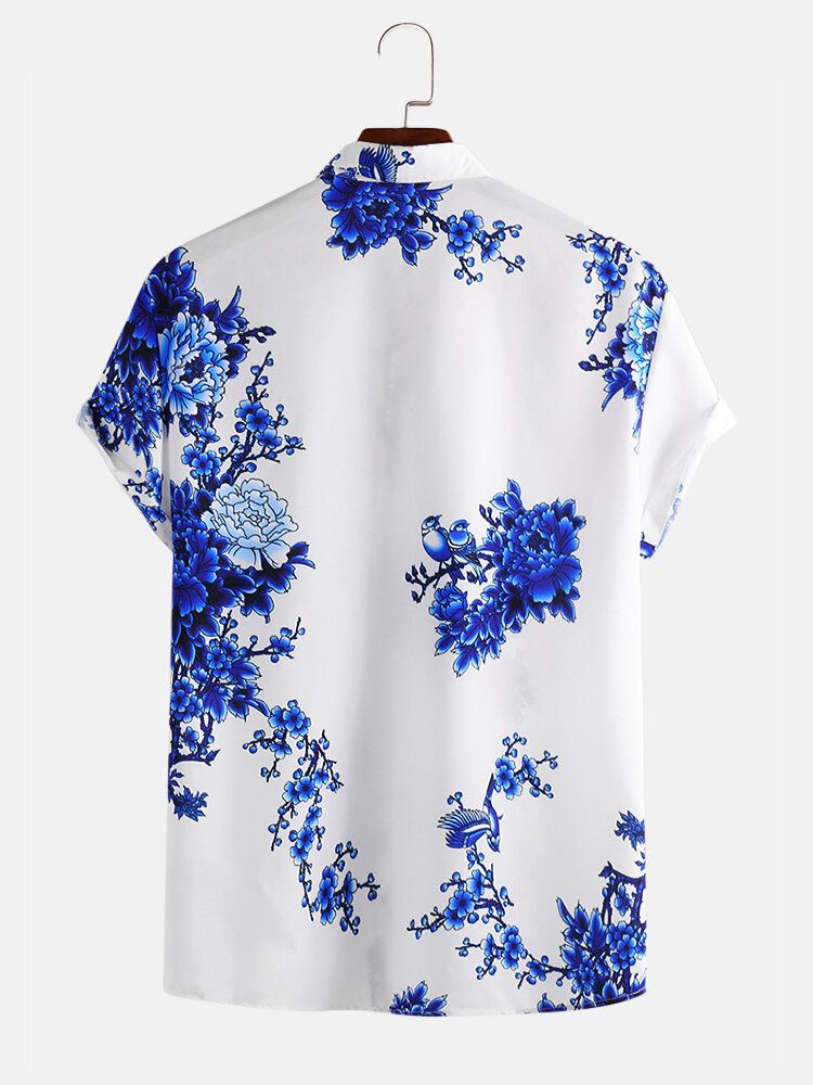 Mens Chinese Style Porcelain Floral Printed Short Sleeve Turn Down Collar Casual Shirt
