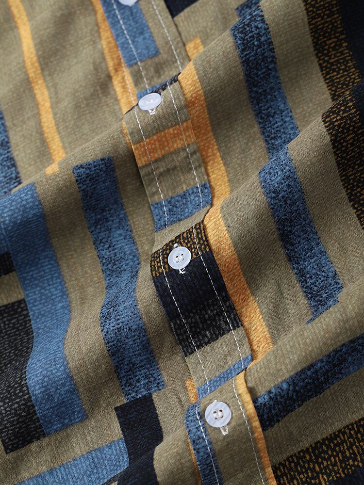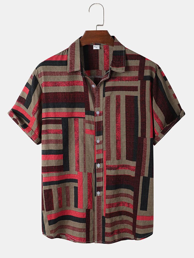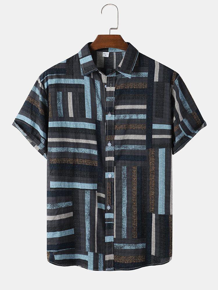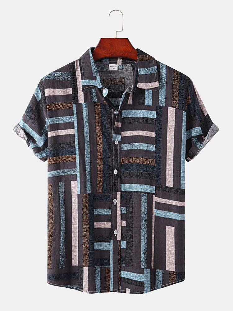 Mens Striped Color Block Lapel Short Sleeve Regular Hem Shirt