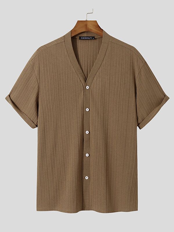 Mens Striped Texture V-Neck Short Sleeved Shirt