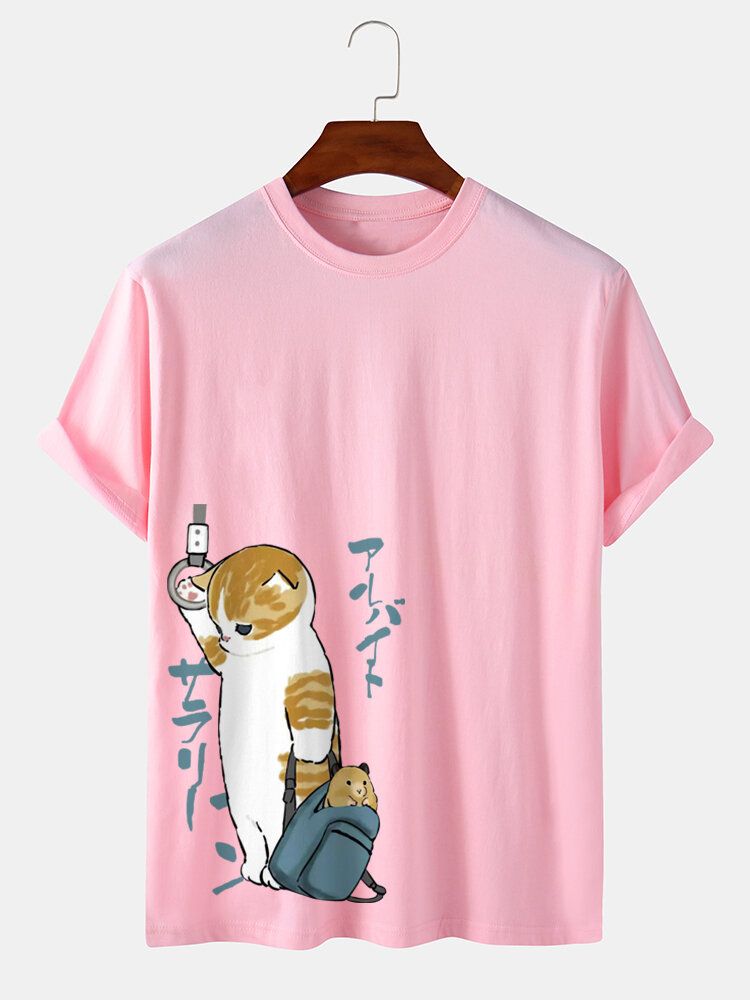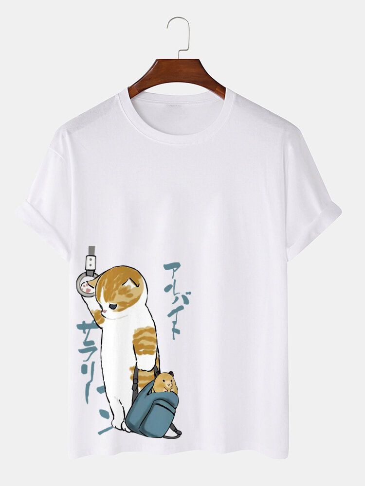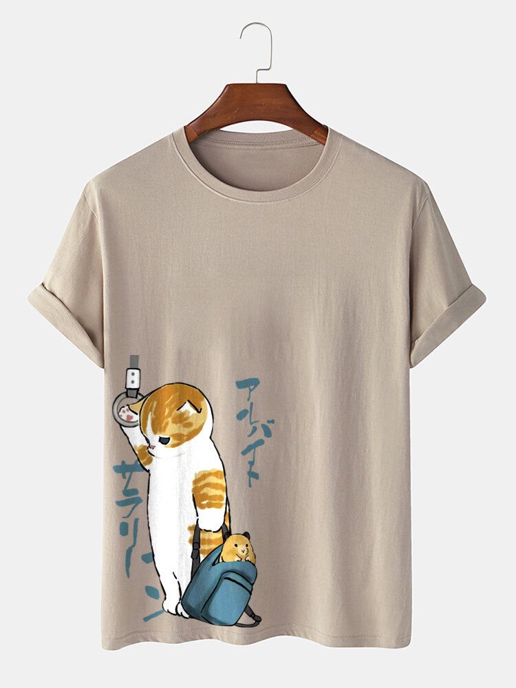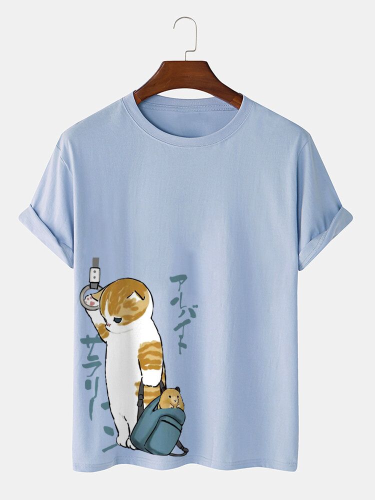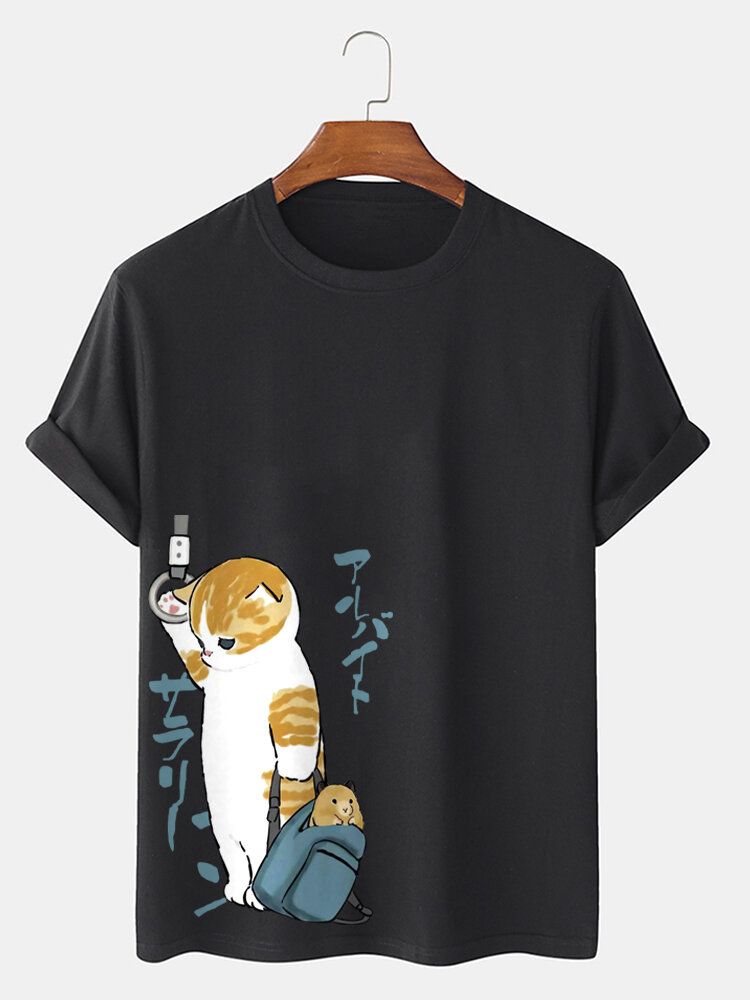 Mens Japanese Style Cat Print Crew Neck Cotton Short Sleeve T-Shirts