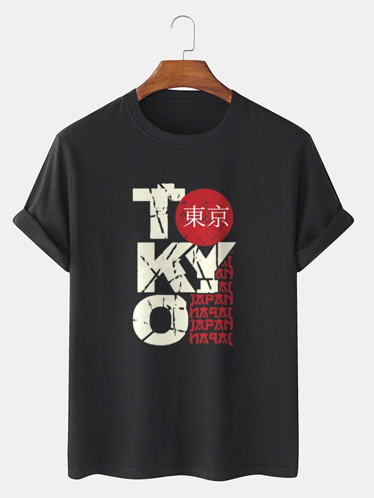 Mens Tokyo Letter Print Street 100% Cotton Short Sleeve T-Shirts