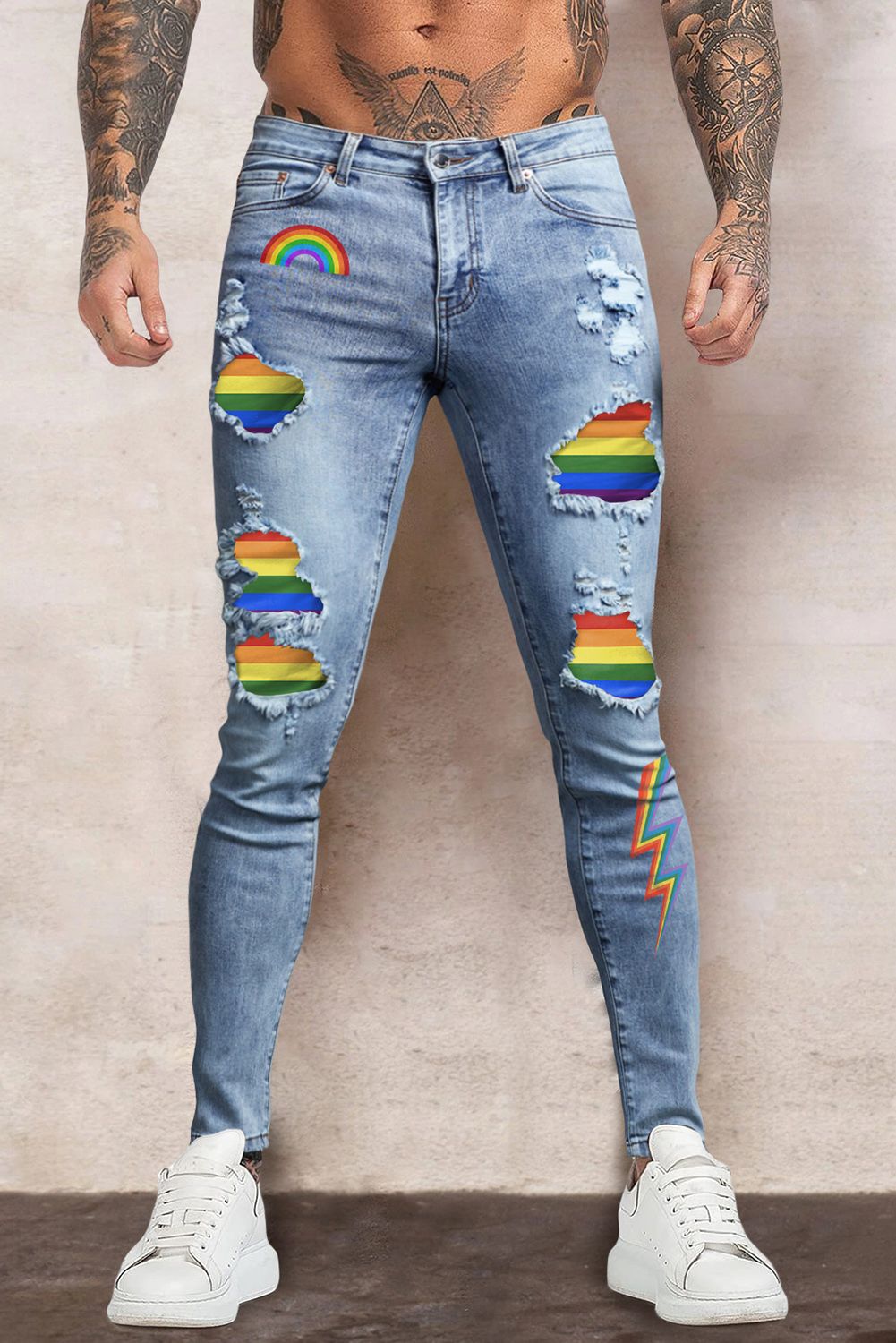 Sky Blue Rainbow Print Patchwork Skinny Distressed Men's Jeans