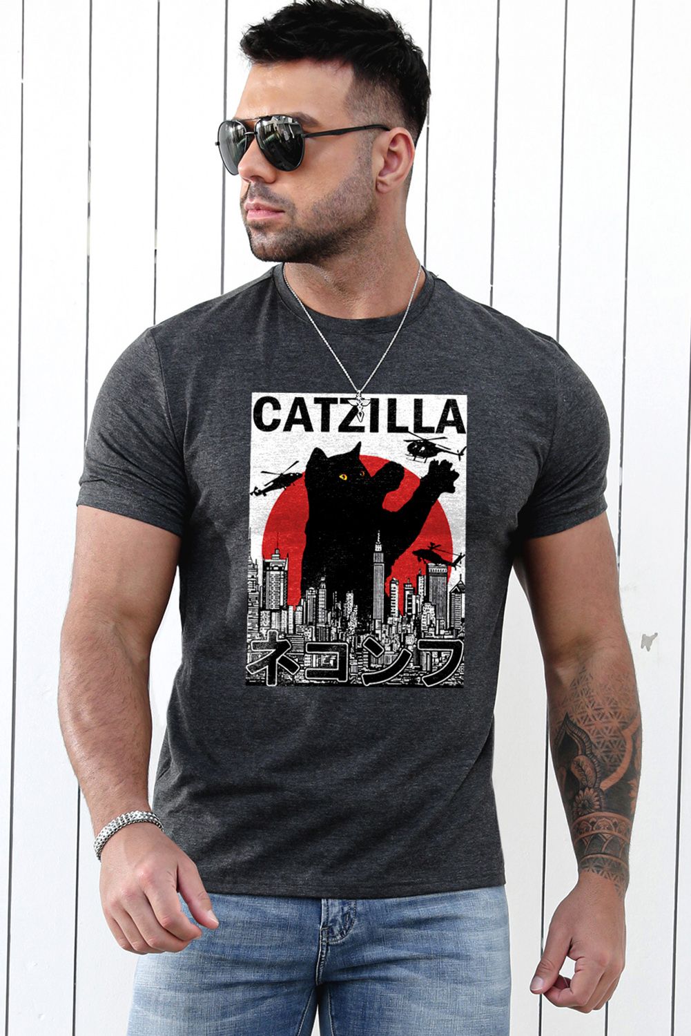 Gray Catzilla Cat Graphic Print Short Sleeve Men's T Shirt