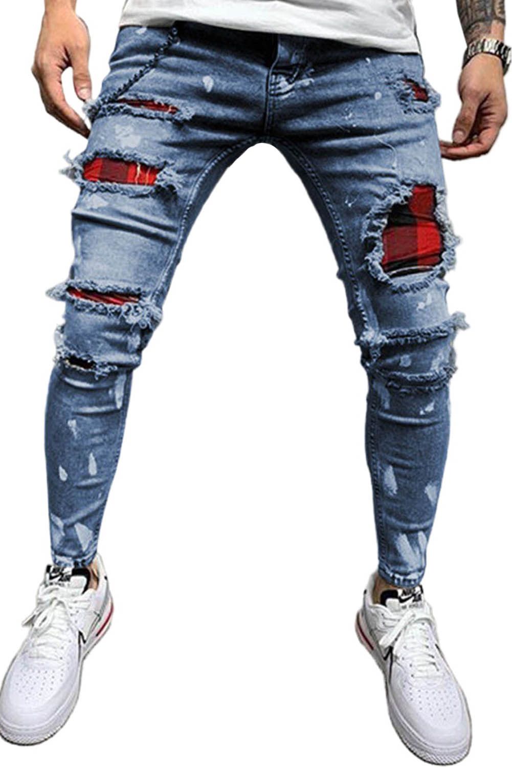 Black Plaid Patchwork Distressed Slim-fit Men's Jeans