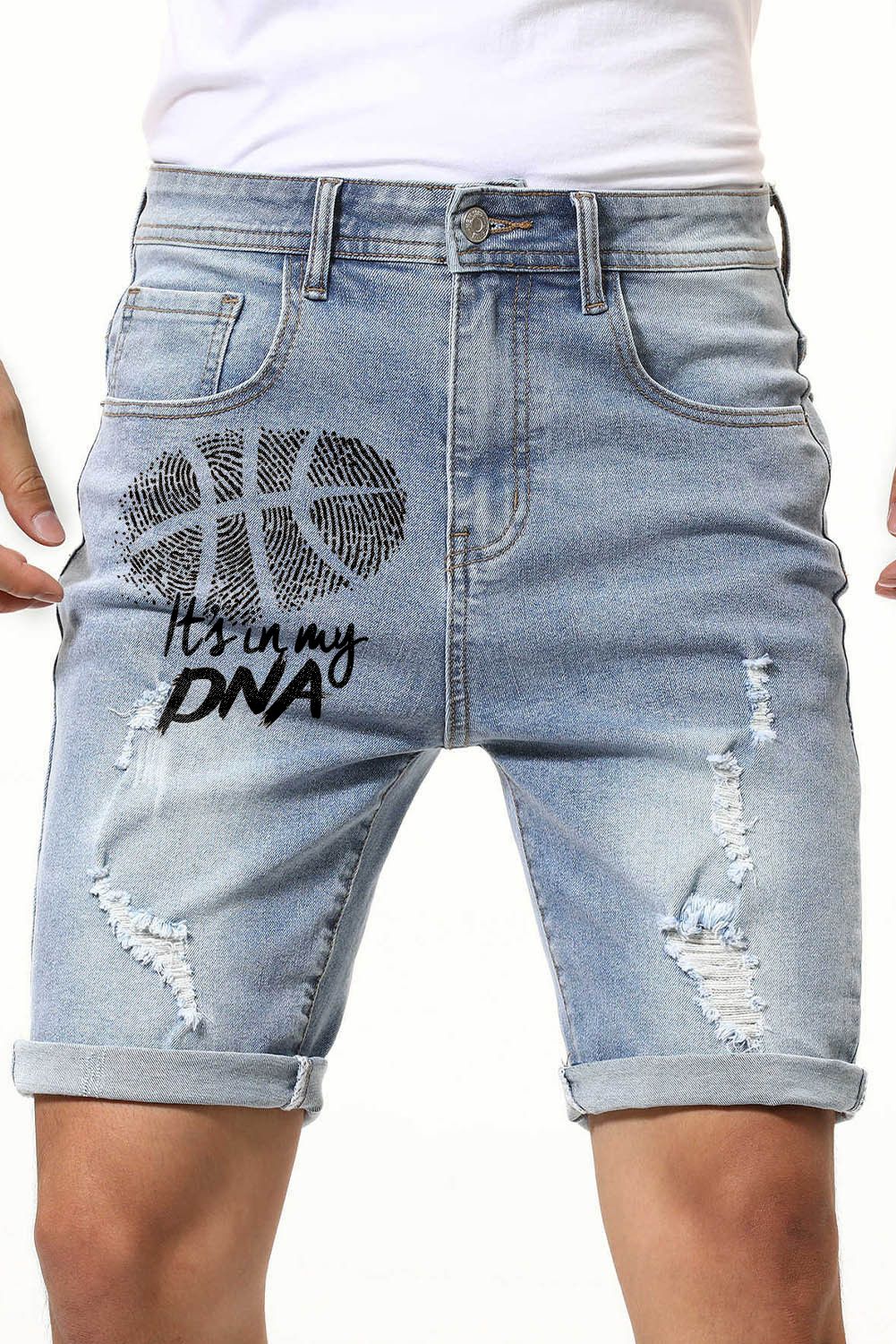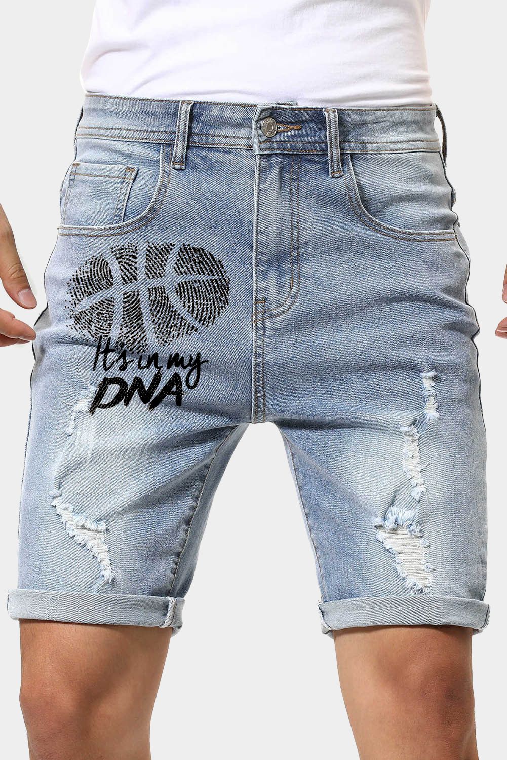Sky Blue It's In My DNA Basketball Print Ripped Rolled Hem Men's Denim Shorts