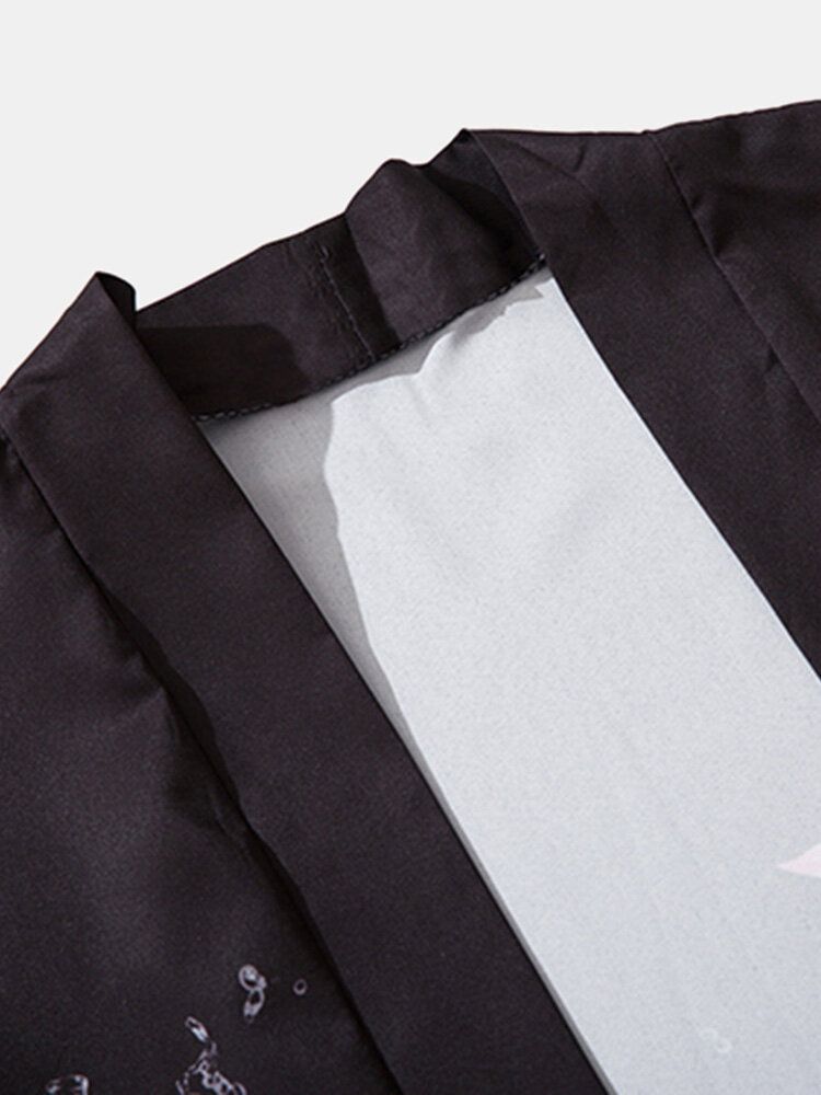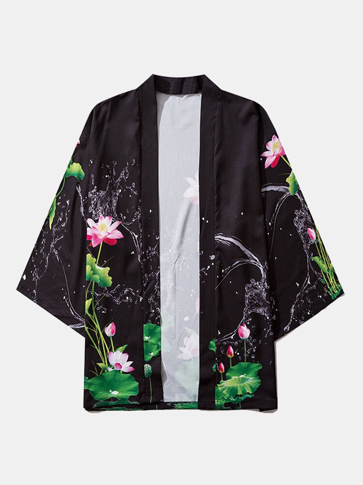 Mens Lotus Printed Open Front Loose 3/4 Sleeve Kimono