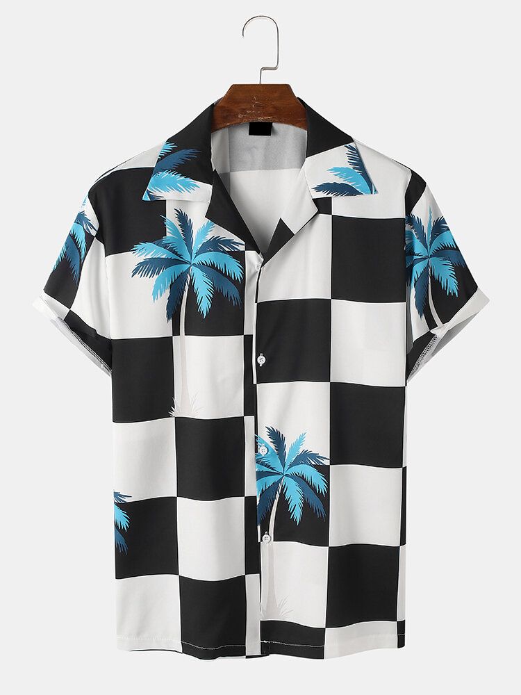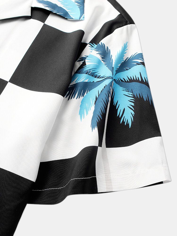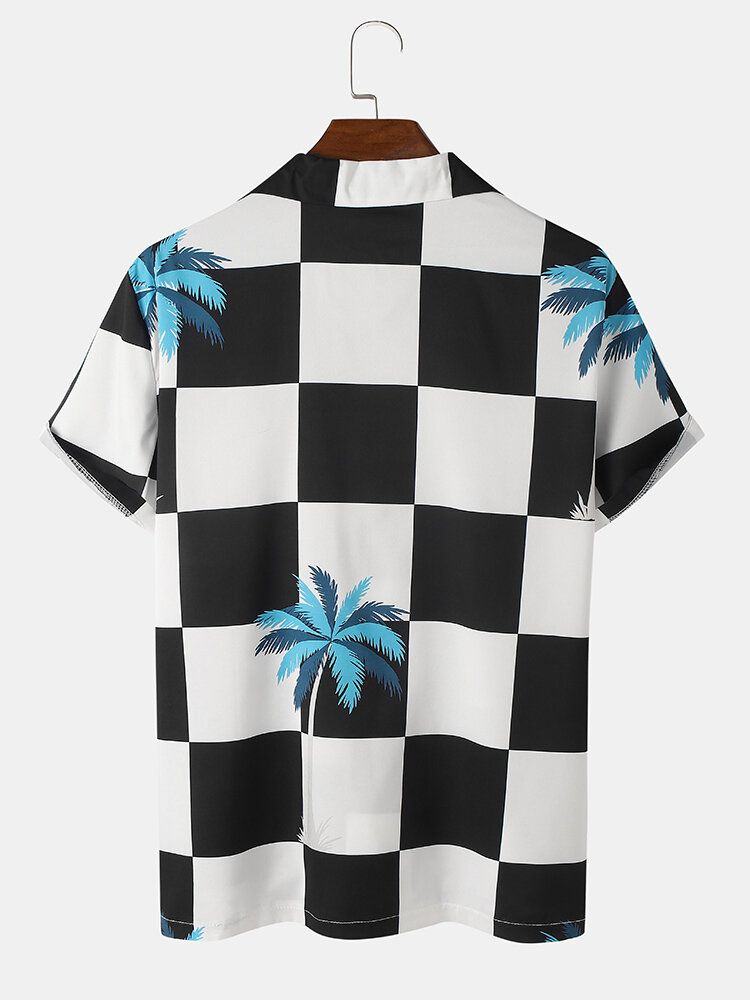 Mens Palm Tree Checkered Print Revere Holiday Short Sleeve Shirts