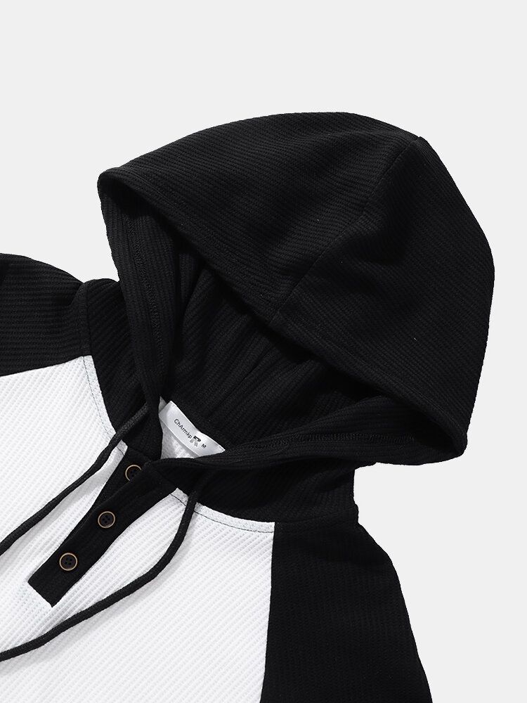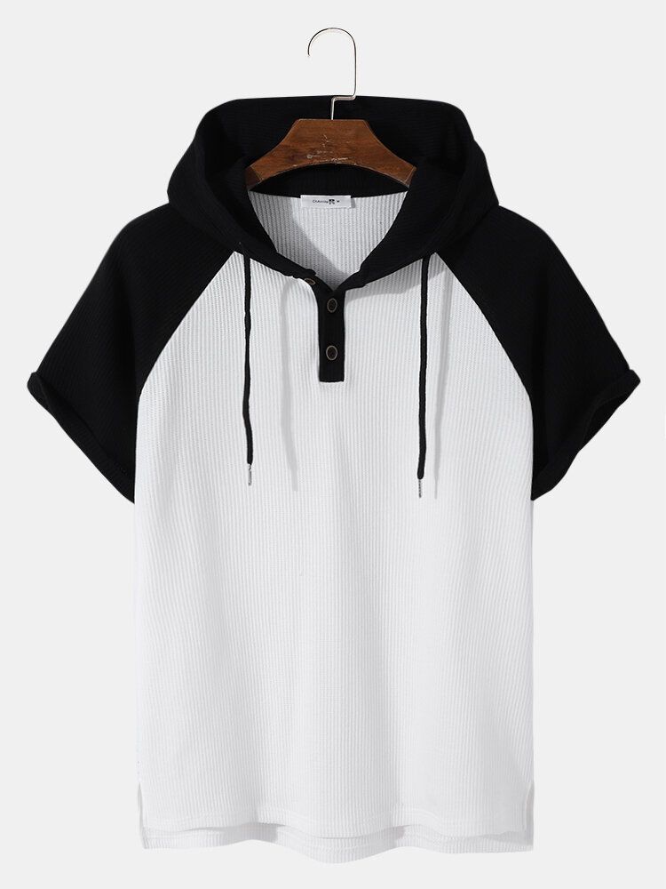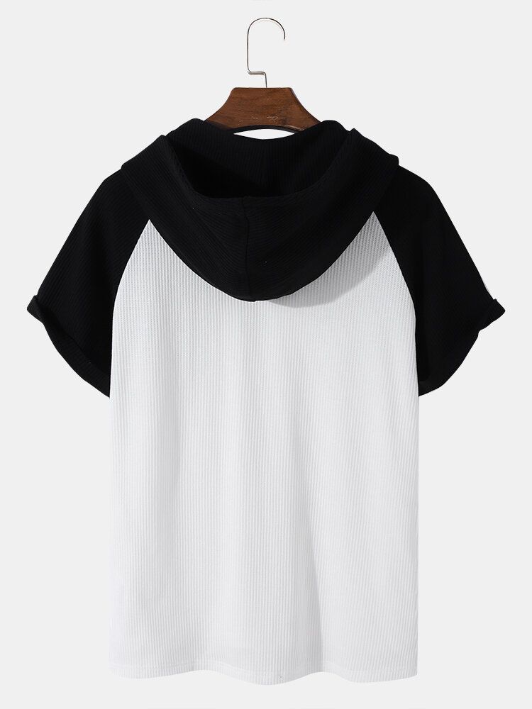 Mens Ribbed Knit Patchwork High Low Preppy Raglan Sleeve Hooded T-Shirts