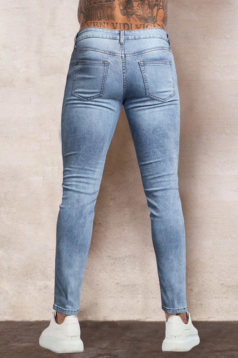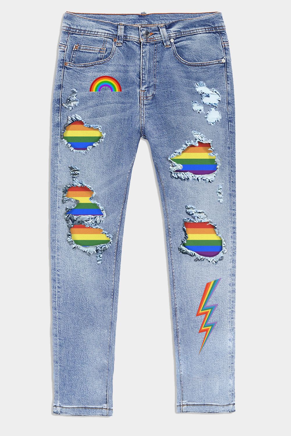Sky Blue Rainbow Print Patchwork Skinny Distressed Men's Jeans